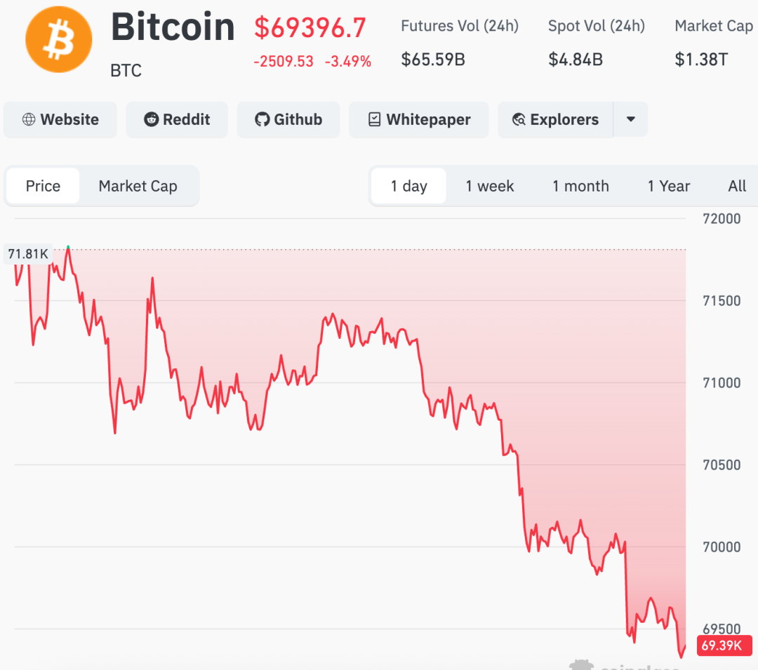 北京时间3月26日晚间,比特币价格突发跳水行情。截至本报发稿时,比特币已击穿70000美元整数关口,最新报价69396美元/枚,单日跌幅扩大至3.49%。