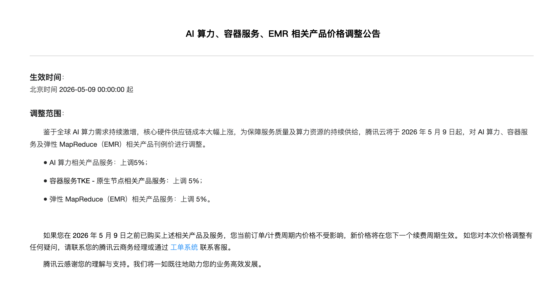 4月9日,腾讯云正式对外发布产品价格调整公告,涉及AI算力服务、容器平台及弹性MapReduce(EMR)三大核心产品线。公告明确指出,受全球AI算力需求指数级增长和核心硬件供应链成本攀升的双重影响,为确保服务稳定性和算力资源持续供给,公司将于2026年5月9日起实施价格调整:AI算力服务费率上调5%,容器服务TKE-原生节点费率同步上调5%,EMR服务费率亦上调5%,已签约客户在现有计费周期内不受影响。