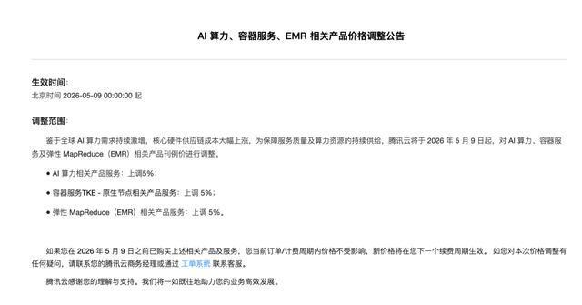 4月9日,腾讯云正式对外公布了关于AI算力、容器服务以及弹性MapReduce(EMR)相关产品的价格调整方案。据公告显示,由于全球范围内对AI算力的需求呈现出爆发式增长态势,同时核心硬件供应链的成本也急剧攀升,为确保服务质量的稳定性和算力资源的持续、可靠供给,腾讯云决定自2026年5月9日起,对上述相关产品的刊例价格进行上调。具体调整幅度为:AI算力相关产品服务价格上调5%;容器服务TKE-原生节点相关产品服务价格同样上调5%;弹性MapReduce(EMR)相关产品服务价格也上调5%。