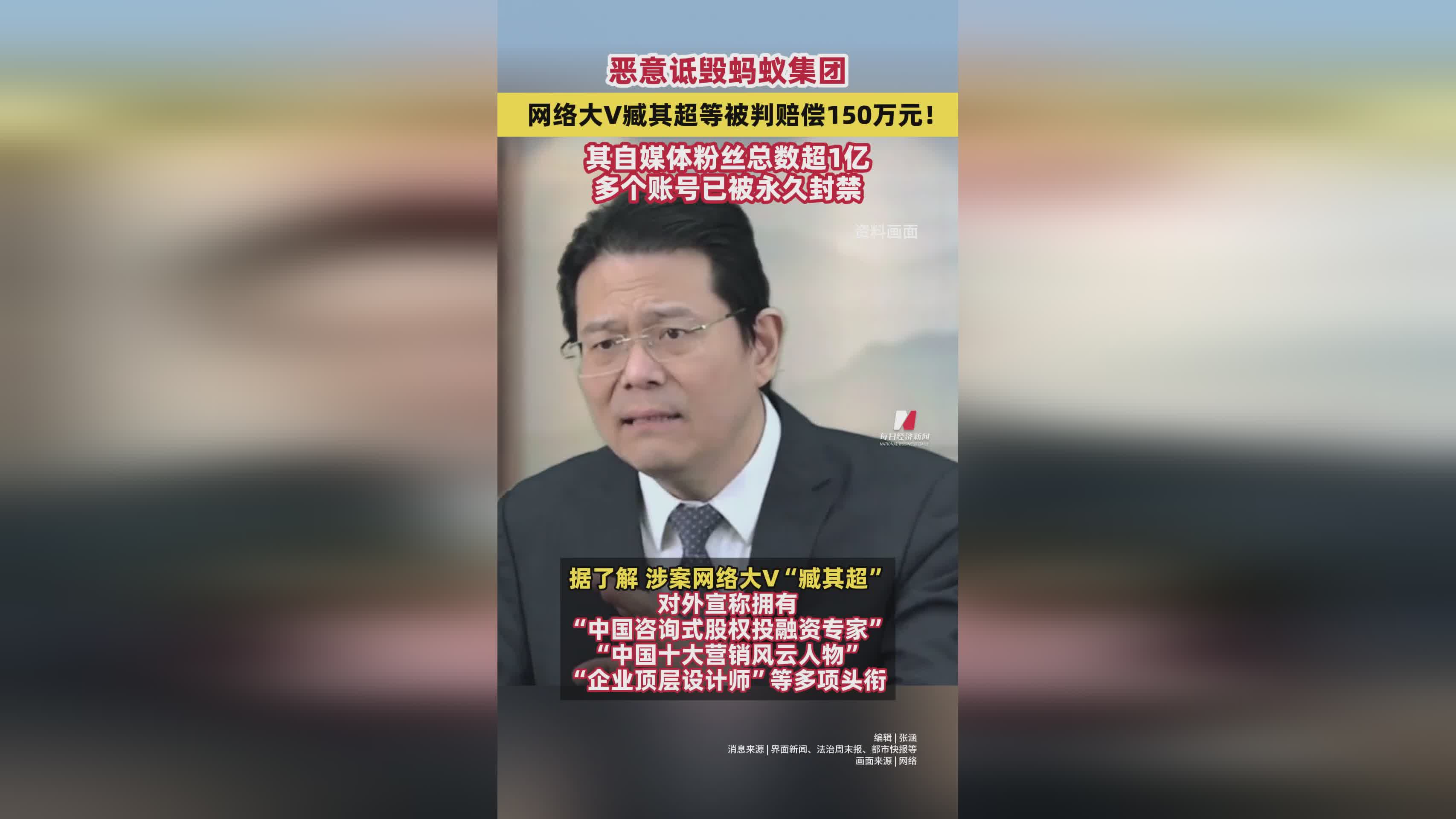网络大V臧其超恶意诋毁蚂蚁集团被判赔偿150万,自媒体账号遭永久封禁