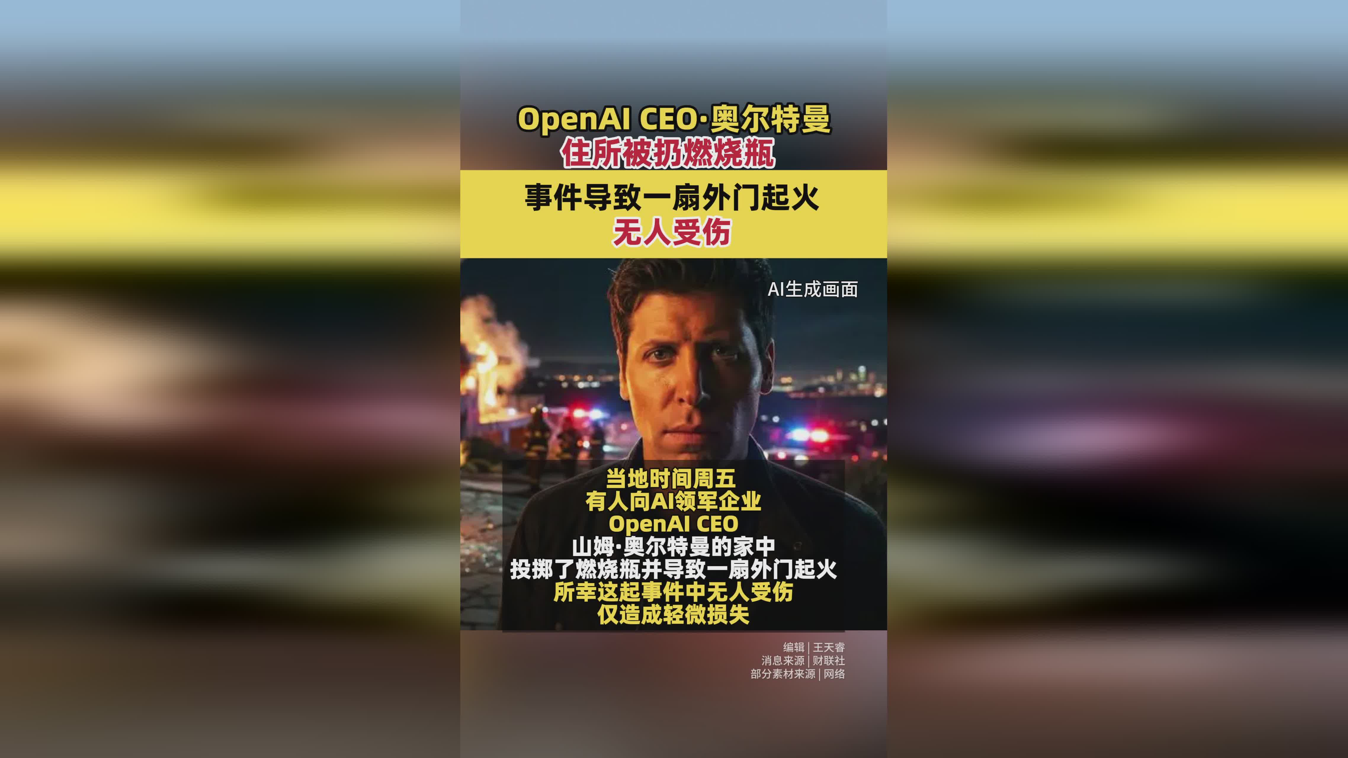 OpenAI CEO奥尔特曼住所遭燃烧瓶袭击 外门起火幸无人伤 本人发文回应引关注