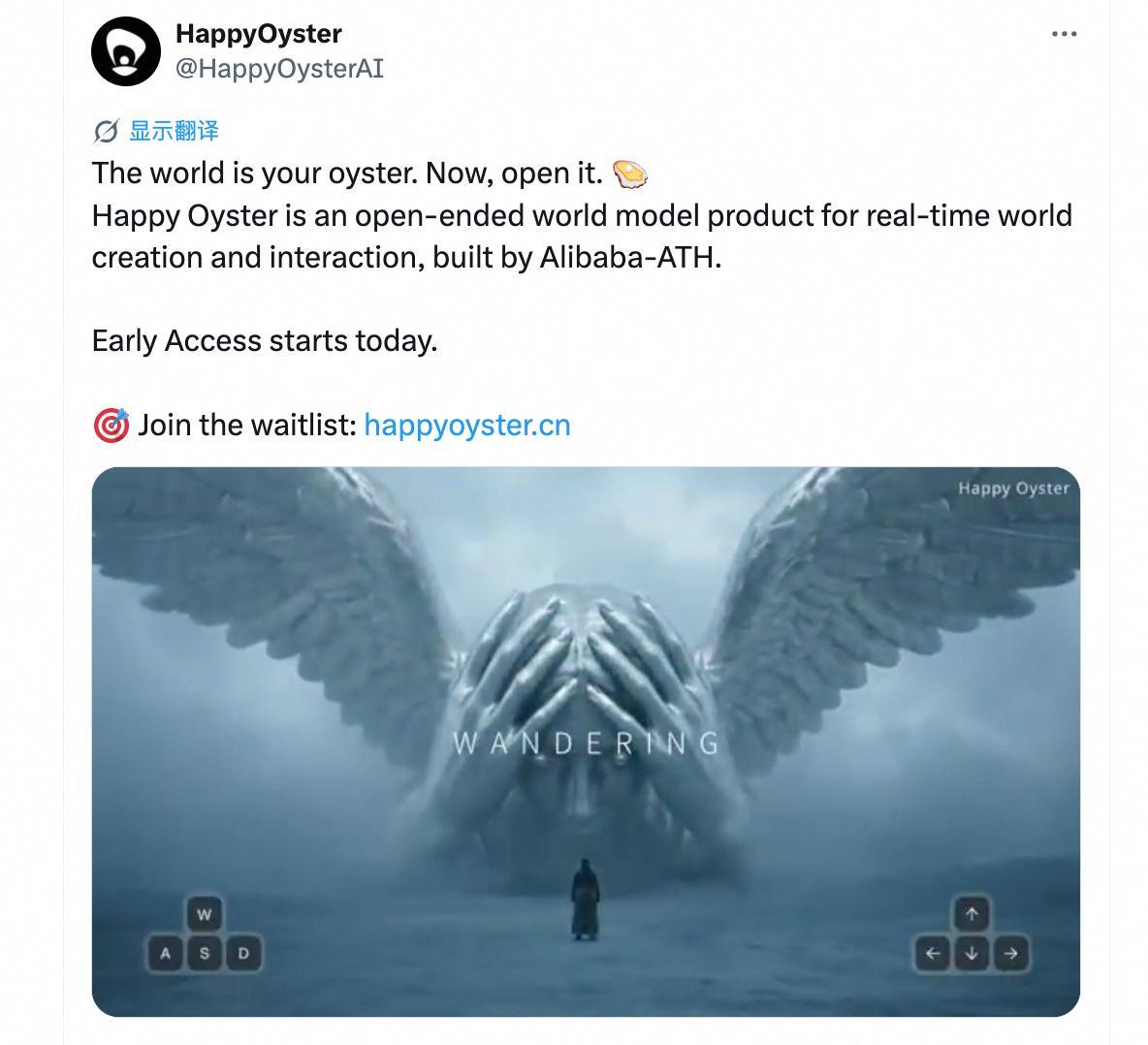 4月16日,徽声在线从权威渠道获悉,阿里巴巴旗下的ATH事业群正式对外发布了一款名为“Happy Oyster”的开放式世界模型产品,该产品以实时世界创建与交互为核心卖点,引起了业界的广泛关注。