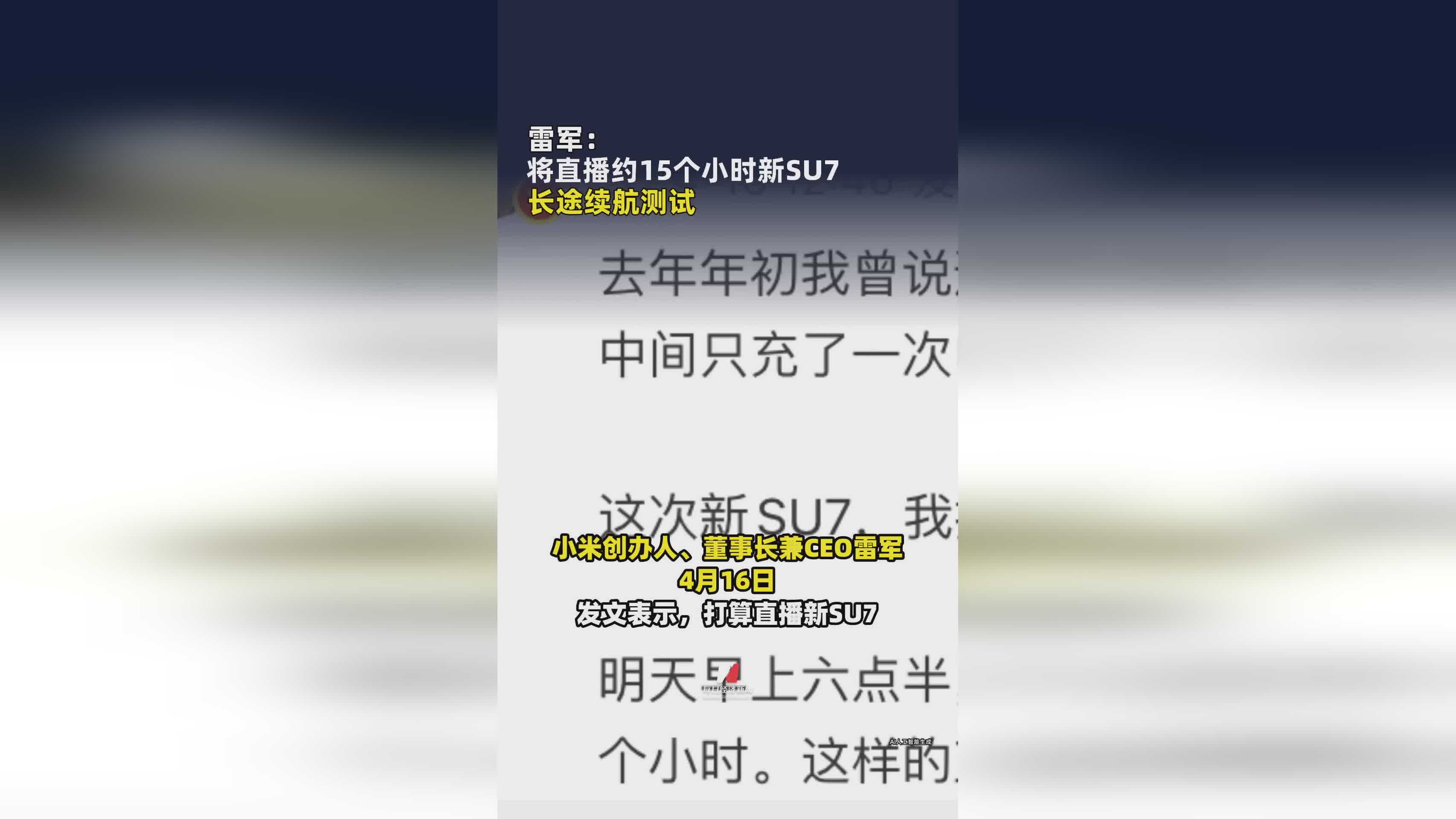 雷军亲自主持:新SU7长途续航测试直播约15小时
