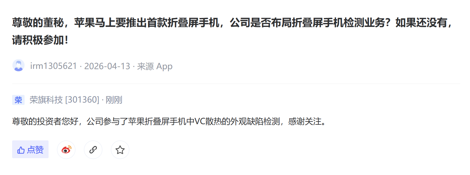 据徽声在线4月16日消息,荣旗科技近日在互动交流平台上透露,该公司已深度参与到苹果折叠屏手机项目的相关检测工作中,具体负责VC散热模块的外观缺陷检测任务。