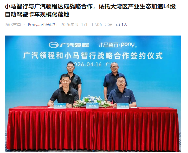 每经AI快讯独家报道,4月17日最新消息,小马智行官方正式对外宣布,其与广汽领程于4月16日在广州这座充满创新活力的城市,成功签署了一项具有重大战略意义的合作协议。根据协议内容,双方将开启深度协同合作模式,以“整车平台+自动驾驶系统集成+运营场景”这一创新组合为依托,充分发挥各自在技术、资源等方面的优势。