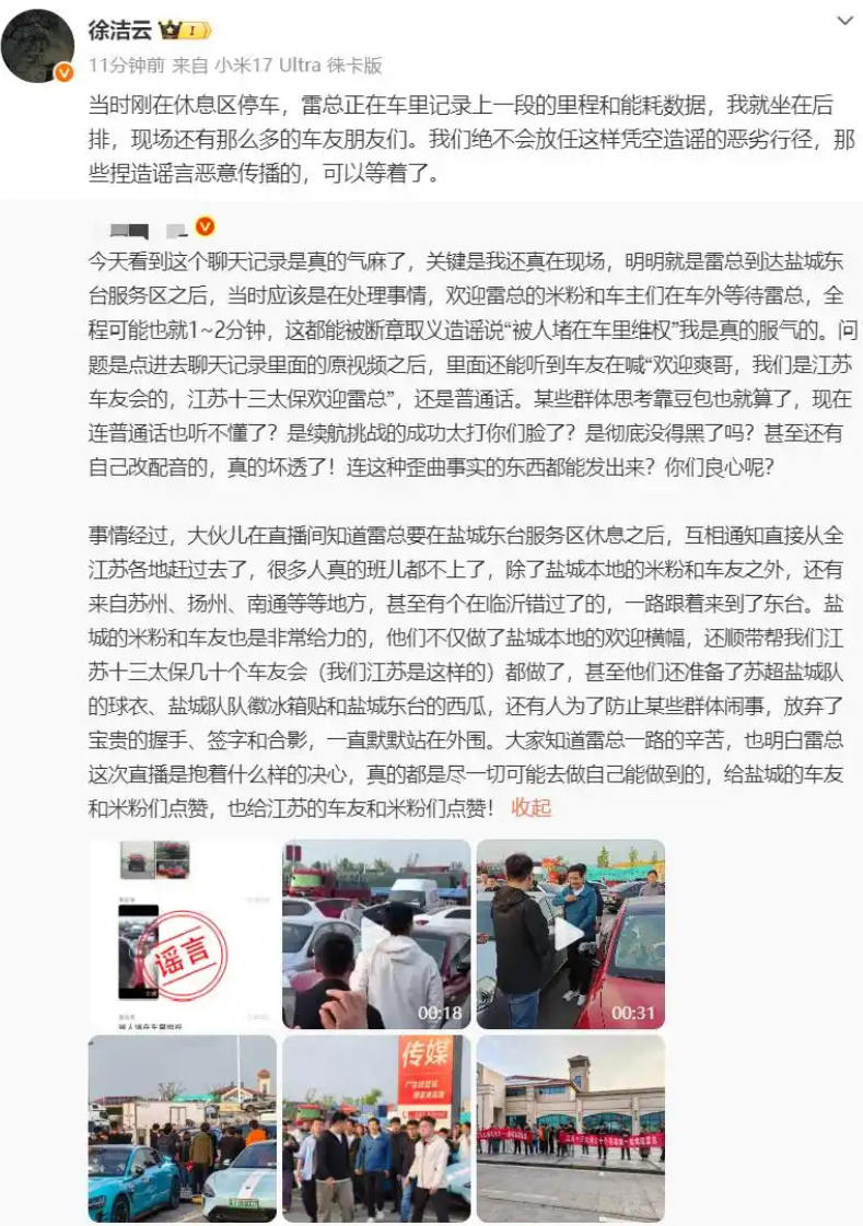 小米徐洁云严正驳斥“雷军车内维权”谣言:恶意传播者将受法律严惩