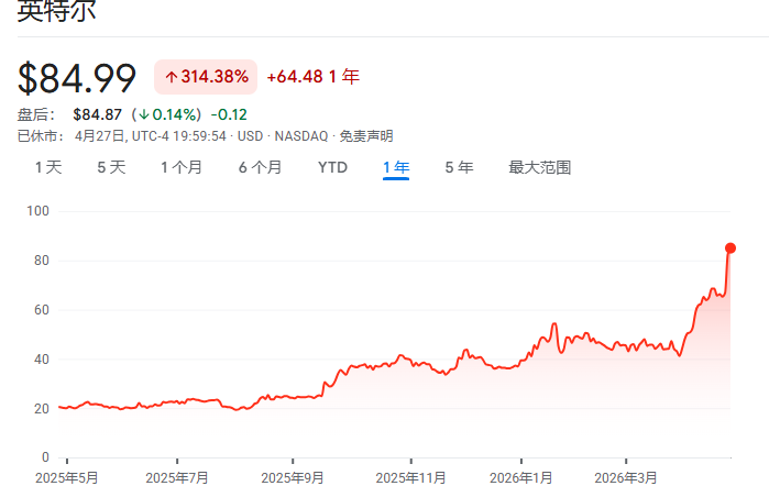 徽声在线4月28日讯(编辑 青枫)在全球AI基础设施建设热潮的强力推动下,英特尔股价于周一早盘交易中再度展现强劲涨势,最终收盘时大涨近3%,股价攀升至84.99美元,一举刷新历史最高收盘纪录。这一积极走势不仅延续了上周英特尔发布亮眼财报后的上涨势头,而且周末传出的一个关于CPU残次品热销的消息,更是如同一把烈火,彻底点燃了投资者对英特尔未来盈利能力的无限信心。