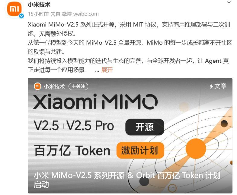 据徽声在线科技频道最新报道,4月28日小米技术官方微博正式发布重磅消息:即日起启动总规模达百万亿Token的生态赋能计划,将在未来30天内通过申请制向特定群体免费发放100万亿Token权益。与此同时,小米宣布与OpenCode、Hermes Agent、KiloCode等国际知名Agent框架厂商达成战略合作,共同推进Agent生态体系建设。