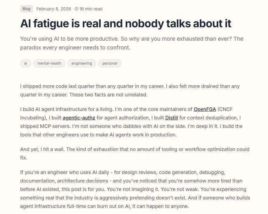 然而,科技公司Ona的一位软件工程师Siddhant Khare,在发表了一篇题为《AI疲劳真实存在,却无人谈及》的文章后,瞬间引发了全球媒体和读者的广泛热议与深入思考。