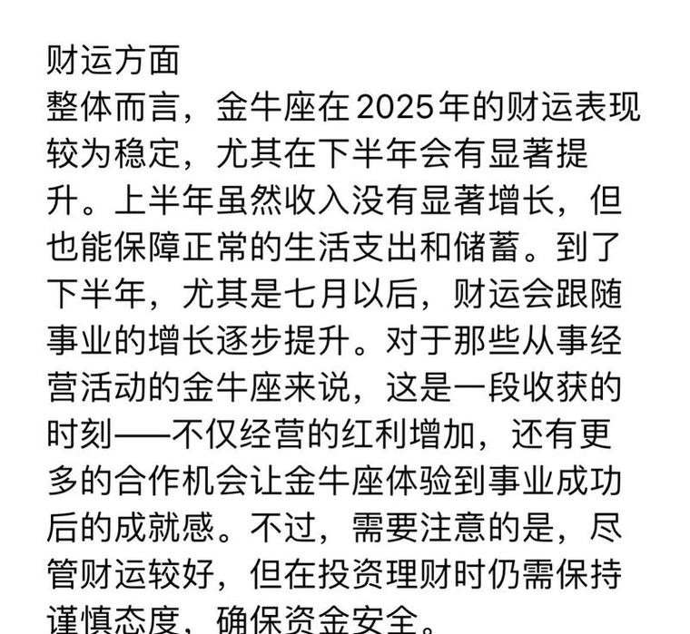 以上就是关于金牛座未来20年运势以及财运状况的详细剖析。希望这些内容能够帮助您更好地了解金牛座的运势走向,为您的未来规划提供有益的参考。看完本文后,如果您觉得内容对您有所帮助,请务必分享给更多的人!