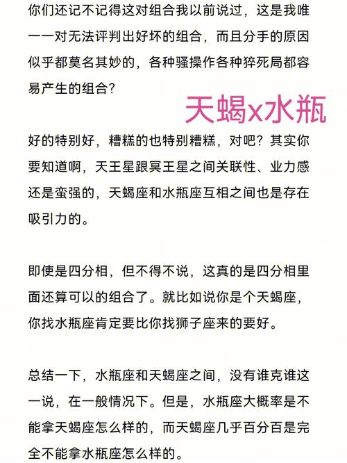 综上所述,就是关于天蝎座女生与水瓶座男生配对的全面解析。希望这些内容能对您有所启发,帮助您更好地理解这两者之间的关系动态。看完本文后,如果您觉得有所帮助,别忘了分享给更多需要的人哦!