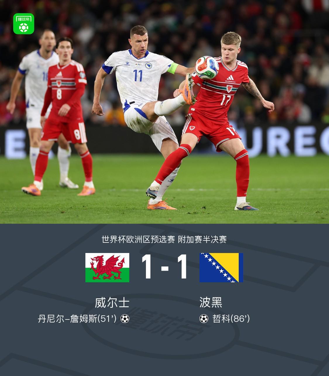 北京时间3月27日,在世界杯欧洲区预选赛附加赛半决赛的激烈对决中,威尔士队与波黑队展开了一场势均力敌的较量。比赛中,威尔士队的丹尼尔-詹姆斯凭借一记精彩的禁区外抽射率先破门,而波黑队则由老将哲科在比赛尾声阶段头球扳平比分,最终双方以1-1握手言和。