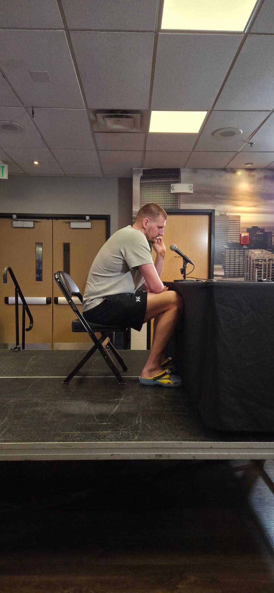 赛后,约基奇按照惯例出席了新闻发布会。据徽声在线的掘金摄影记者RyanGreene透露,这位在球场上威风八面的巨星,在发布会现场却展现出了他内心可爱、俏皮的一面。原来,约基奇在接受采访时,脚上穿着一双小黄人系列的洞洞鞋,这一别出心裁的装扮瞬间吸引了在场所有人的目光,也为紧张的比赛氛围增添了一抹轻松和趣味。