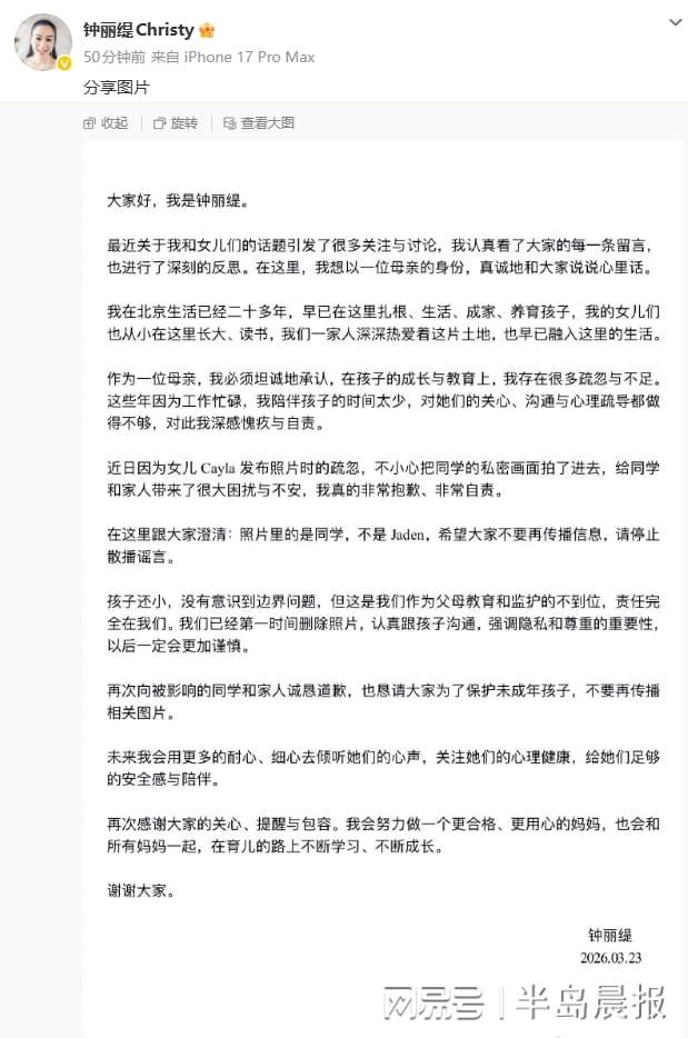 3月23日午间时分,钟丽缇针对女儿Cayla此前在社交平台上引发的争议事件,正式发布声明并公开致歉。她表示:'身为母亲,我必须直面自己在子女教育方面的缺失与不足。近年来由于工作安排过于密集,我陪伴孩子的时间被大幅压缩,导致在情感沟通、心理关怀以及隐私保护教育等层面存在明显疏漏,对此我深感痛心与自责。'