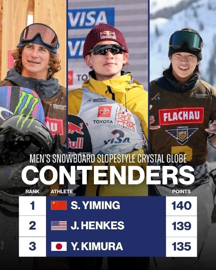 原本计划进行的瑞士席尔瓦普拉纳站收官战,因遭遇恶劣天气状况,男子组比赛无奈取消。如此一来,本赛季的积分榜排名就此尘埃落定。苏翊鸣凭借着此前一系列赛事中稳定且出色的发挥,最终以140分的优异成绩,稳稳占据积分榜榜首位置。