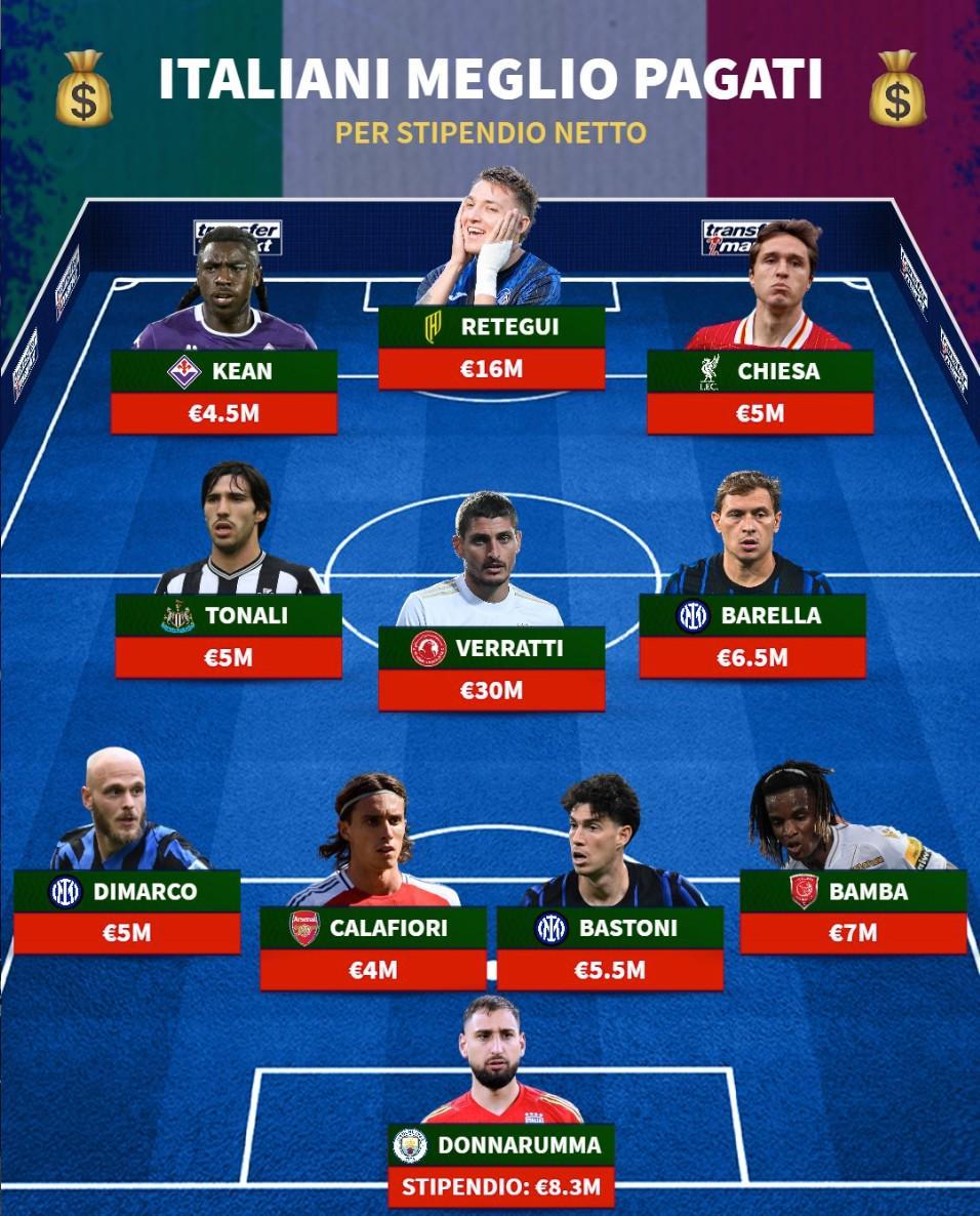 北京时间3月28日消息,根据权威转会数据平台德转的最新统计,目前意大利籍球员中年薪最高的11人阵容已揭晓。其中,现效力于卡塔尔联赛杜海勒俱乐部的中场核心维拉蒂以3000万欧元的年薪傲居榜首,而效力于沙特联赛胡拜尔库迪西亚俱乐部的锋线新星雷特吉则以1600万欧元紧随其后,位列第二。