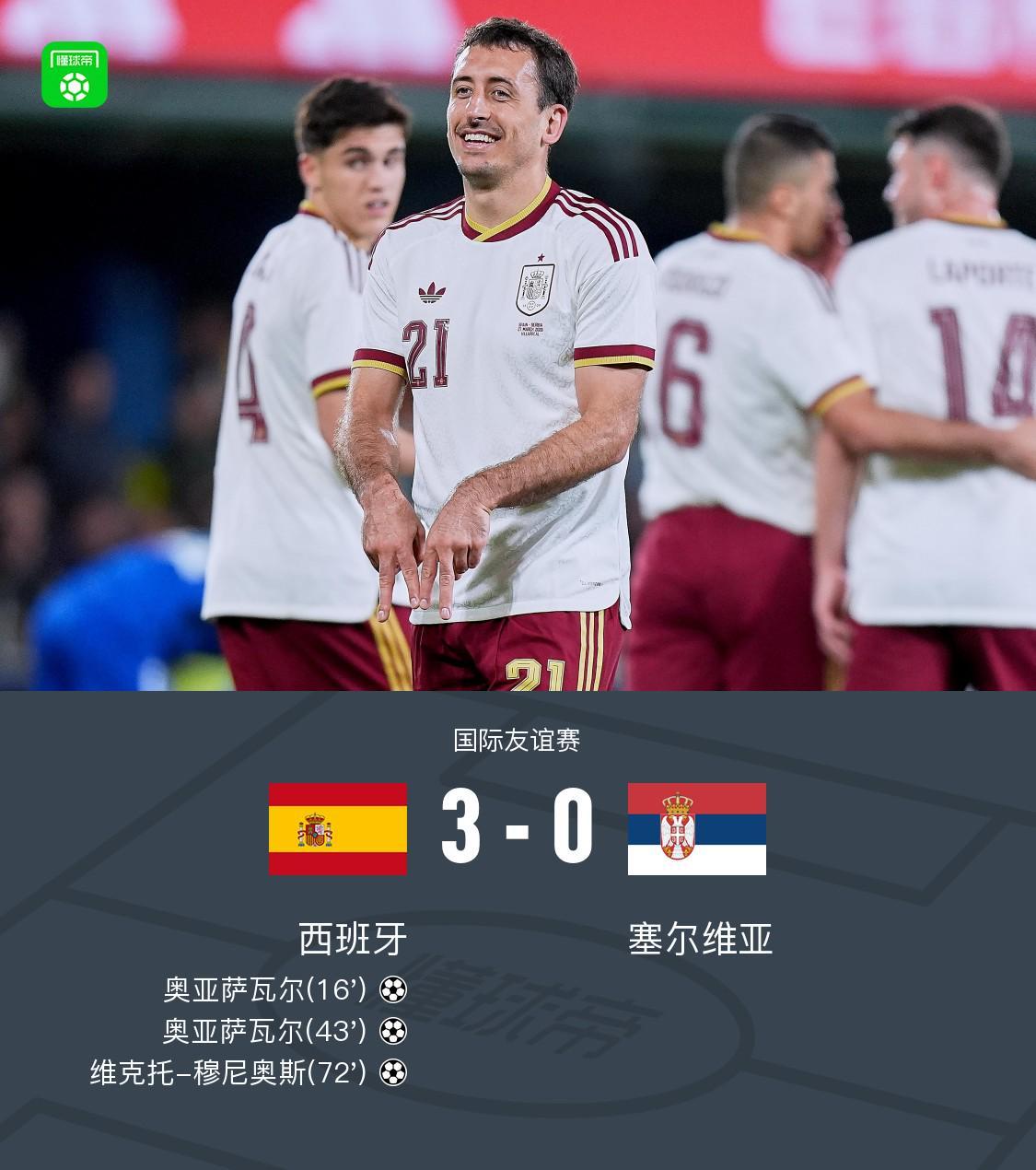 西班牙3-0完胜塞尔维亚,奥亚萨瓦尔双响闪耀,穆尼奥斯锁定胜局