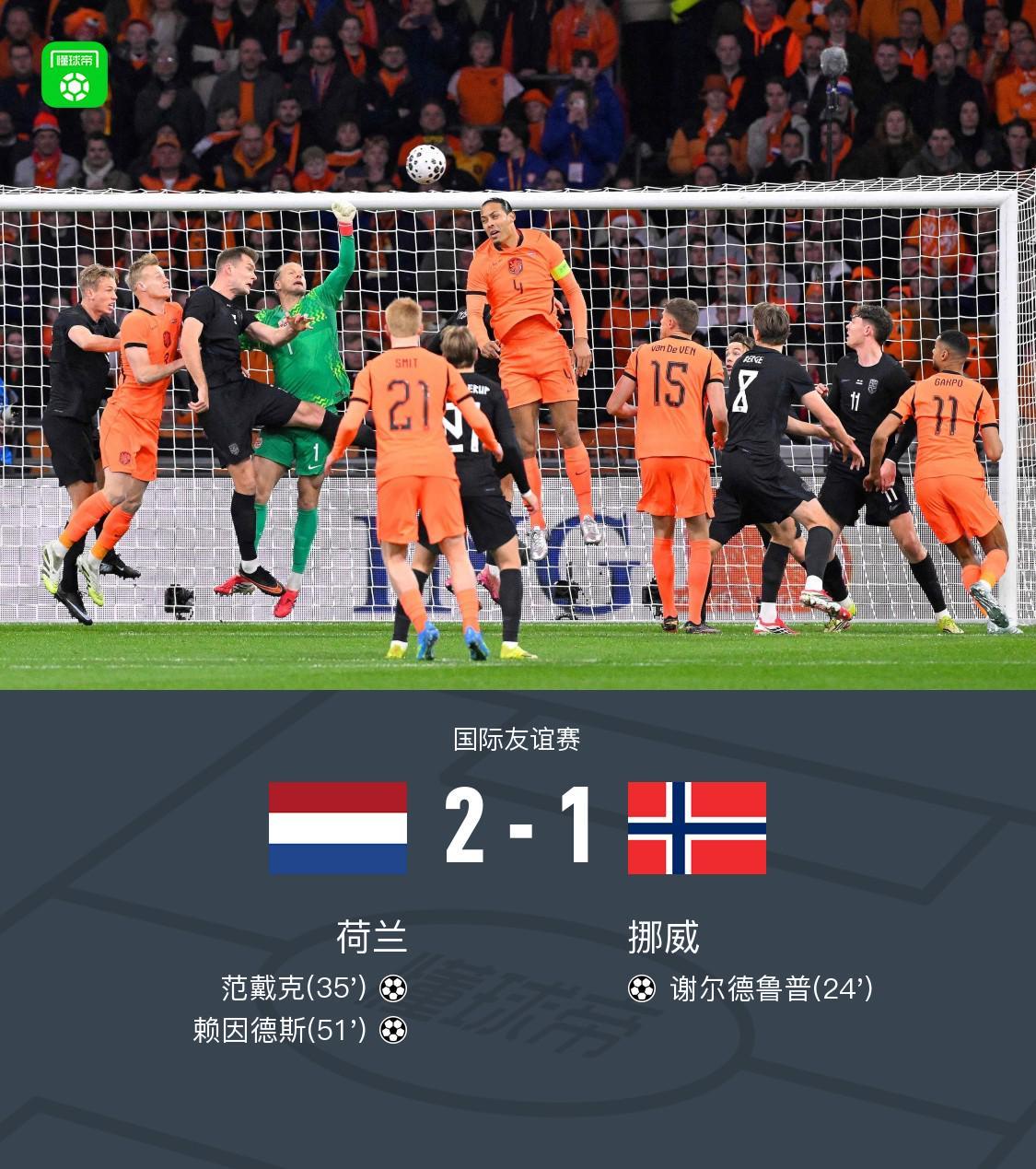 荷兰2-1力克挪威,范戴克头槌建功,赖因德斯反超比分