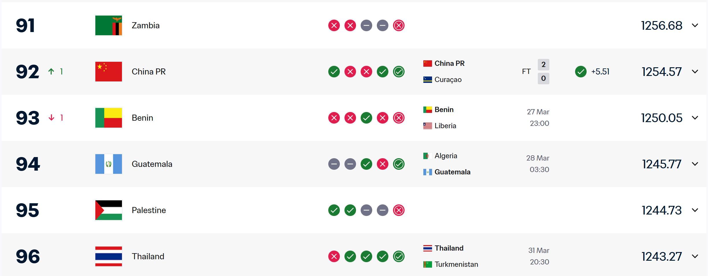 根据FIFA积分计算规则,本场胜利使中国队收获5.51个积分,总积分达到1305.39分。这一积分变动导致国足在排名上反超贝宁队(1304.88分),但距离第91位的刚果(布)仍有1.2分的差距。输球的库拉索队则扣除相应积分,继续以1321.46分位列第81位。