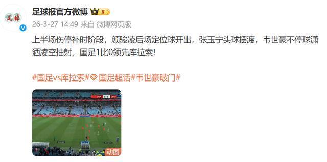 比赛进入上半场伤停补时阶段,场上气氛愈发紧张。此时,国足门将颜骏凌在后场果断开出定位球,精准地将球送至对方半场。张玉宁反应迅速,高高跃起,用一记漂亮的头球摆渡,将球巧妙地过渡到危险区域。韦世豪抓住这稍纵即逝的机会,不停球直接凌空抽射,皮球如离弦之箭般直窜球门死角,国足凭借这粒精彩进球,以1比0的比分领先库拉索队!