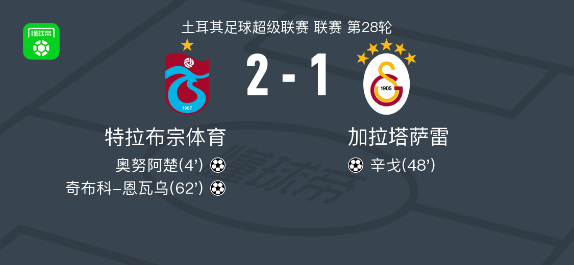 土超第28轮:特拉布宗体育2-1险胜加拉塔萨雷,双前锋建功制胜