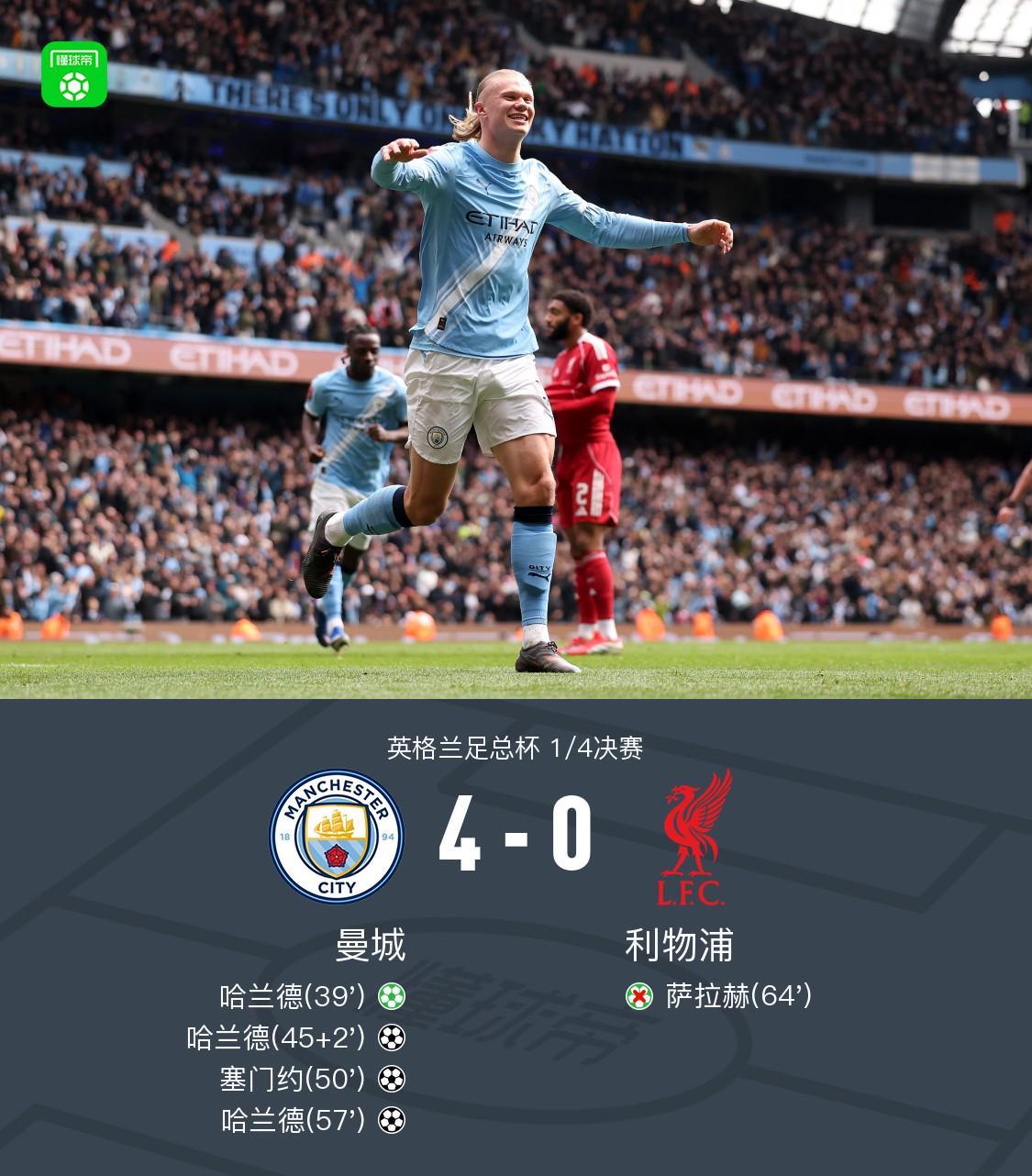 徽声在线丨曼城4-0横扫利物浦晋级足总杯四强,哈兰德戴帽塞门约传射