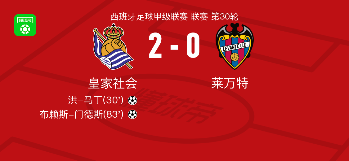 西甲第30轮:皇家社会2-0力克莱万特,洪-马丁与布赖斯-门德斯联袂建功