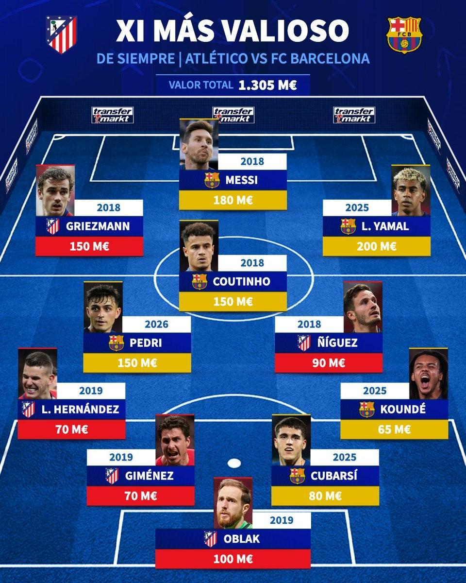以下是德转评选的马竞+巴萨历史最贵11人阵容详情: