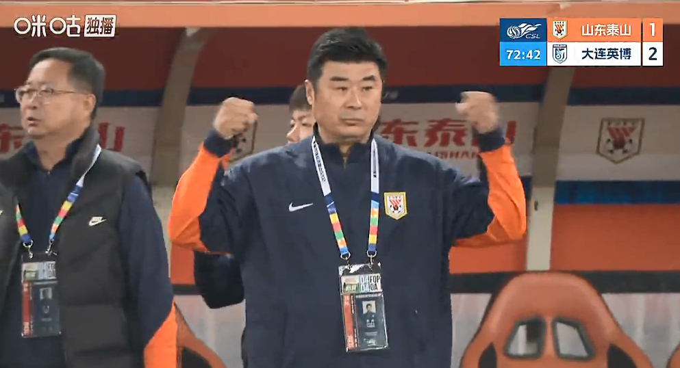 追回一球后,山东泰山士气大振,试图再进一球扳平比分。然而,大连英博却打起了十二分精神,防守固若金汤,不再给山东泰山任何机会。眼看着球队迟迟无法追平比分,韩鹏在场边急得团团转,来回踱步。相比之下,名义上的主教练宿茂臻却稳坐替补席(下图),若有所思,似乎在思考着下一步的对策。