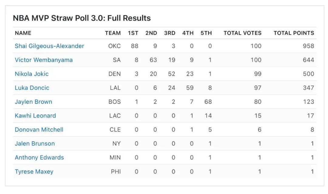 值得一提的是,这个模拟投票的权威性和参考性极高。ESPN特意模仿了NBA最终的MVP投票流程,邀请了100位来自地方、全国乃至国际媒体的资深记者进行投票。其中,部分参与模拟投票的记者还拥有最终的正式投票权,这无疑增加了模拟投票的准确性和可信度。