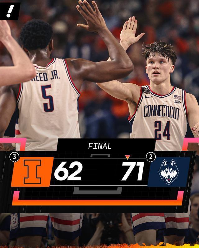 在康涅狄格大学与伊利诺伊大学的对决中,康大以71比62的比分笑到了最后。主教练丹·赫尔利再次展现了他的执教才华,率领康大在4年内第3次闯入疯三决赛。值得一提的是,此前两次进入决赛的康大,都成功登顶,收获了冠军的荣耀。本场比赛,康大在上半场最后阶段逐渐拉开比分,此后便一直保持领先,最多时领先优势达到了14分。小塔里斯·里德发挥出色,为康大贡献了17分和11个篮板,而上一轮完成神奇绝杀的穆林斯,本场也有15分入账。伊利诺伊方面,明星新生瓦格勒虽然砍下了20分、8个篮板和2次助攻,但无奈球队整体表现不佳,最终只能接受失利的苦果。