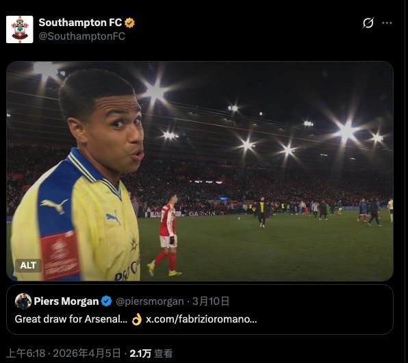 南安普顿足总杯淘汰阿森纳,官方社媒“挖坟”摩根豪言