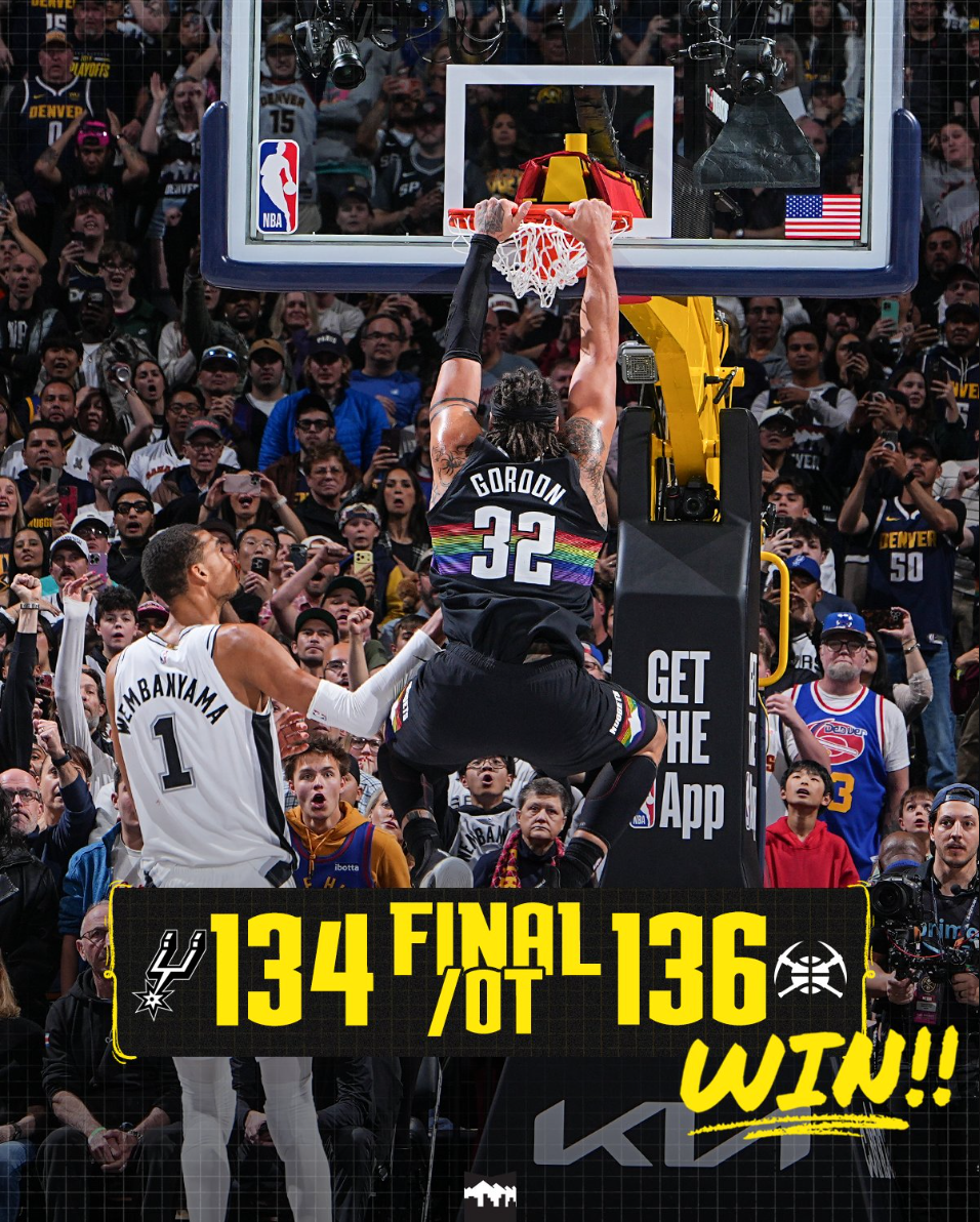 北京时间4月5日,NBA常规赛迎来一场焦点对决,丹佛掘金队经过加时苦战,以136-134惊险战胜圣安东尼奥马刺队,豪取八连胜的同时,也终结了马刺队的11连胜势头。这场比赛被外界视为约基奇与文班亚马之间的MVP直接对话,最终,约基奇在关键时刻挺身而出,末节连续砍下7分,助力掘金队锁定胜局。从数据对比来看,约基奇无疑全面压制了文班亚马,两人虽同为顶尖球员,但此役表现显然不在同一水平线上。