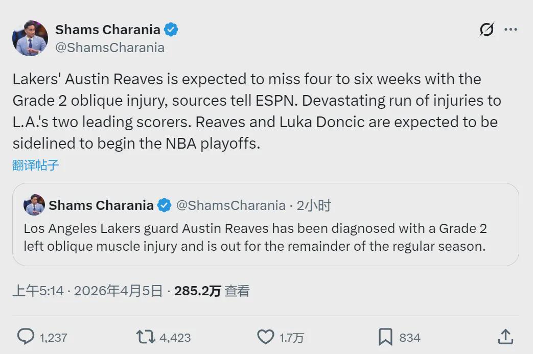北京时间4月5日凌晨,根据NBA知名记者Shams的最新消息,洛杉矶湖人队的后卫奥斯汀-里夫斯遭遇了二级腹斜肌拉伤的伤病,预计将因此缺席接下来的4到6周时间。这一伤情不仅意味着里夫斯将无缘本赛季剩余的常规赛,同时也将缺席季后赛首轮的较量。值得一提的是,本赛季独行侠的东契奇也因伤赛季报销,两人场均合计能够砍下57分,占据了全队得分的48.9%,是球队不可或缺的得分点。