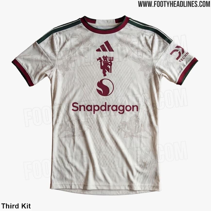 据透露,阿迪达斯此次为曼联打造的26-27赛季第三球衣,以米白色作为主色调,并巧妙地融入了深绿色和酒红色作为点缀。尽管在配色方案上,它与23-24赛季的客场球衣有着异曲同工之妙,但在设计风格上却展现出了截然不同的独特魅力。