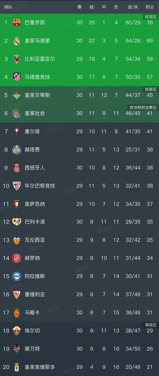 西甲最新积分榜概览