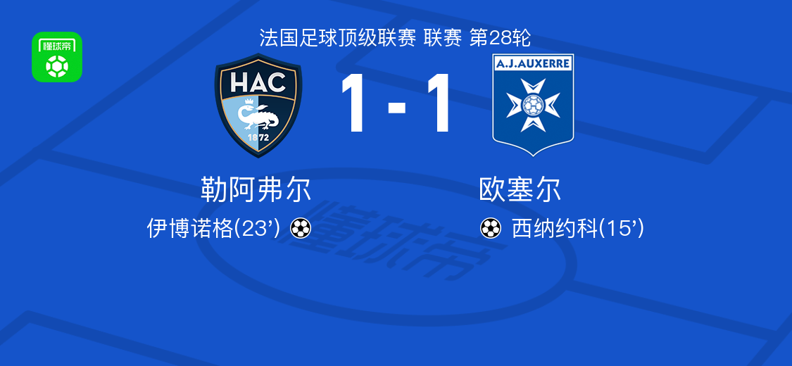 北京时间4月5日晚间,法国足球顶级联赛迎来第28轮的激烈角逐,勒阿弗尔坐镇主场迎战来访的欧塞尔队。本场比赛,勒阿弗尔的伊博诺格与欧塞尔的西纳约科分别建功,最终双方以1-1的比分握手言和。