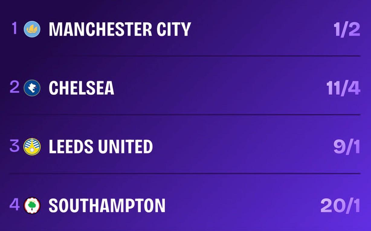 北京时间4月6日,随着利兹联在点球大战中成功淘汰西汉姆联,本赛季英格兰足总杯的四强名单终于尘埃落定。知名体育数据机构Squawka随即公布了四支球队的夺冠赔率,其中曼城以绝对优势领跑,切尔西紧随其后,利兹联位列第三,而爆冷击败阿森纳的南安普顿则排在最后。