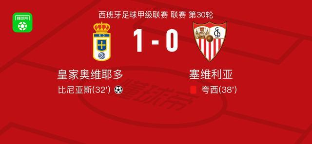 西甲第30轮:皇家奥维耶多1-0力克塞维利亚,比尼亚斯建功