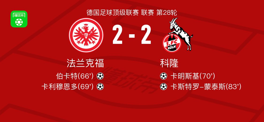 德甲第28轮:法兰克福2-2战平科隆,双方各进两球难分胜负