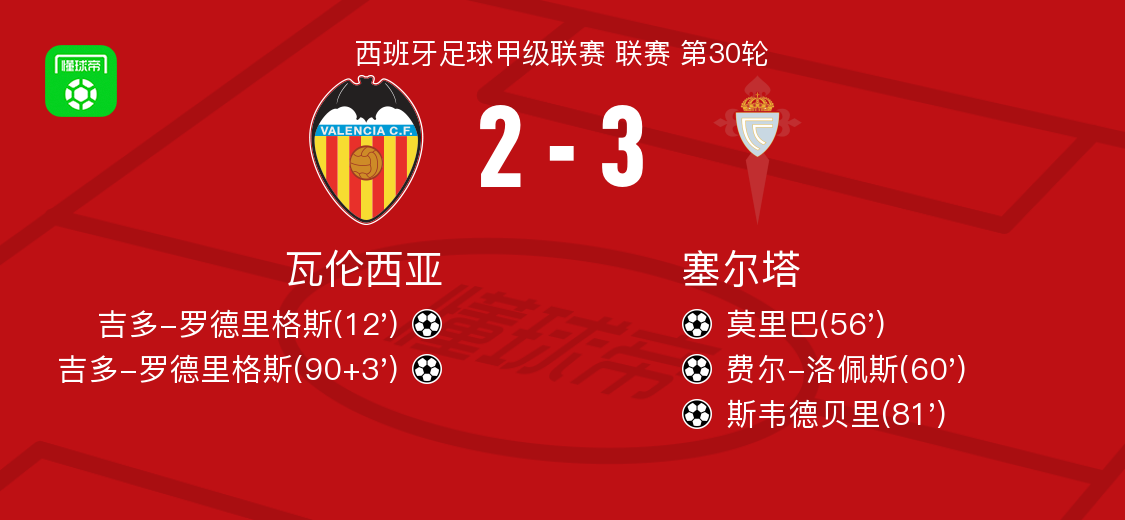 西甲第30轮:塞尔塔3-2客场逆转瓦伦西亚,斯韦德贝里传射建功