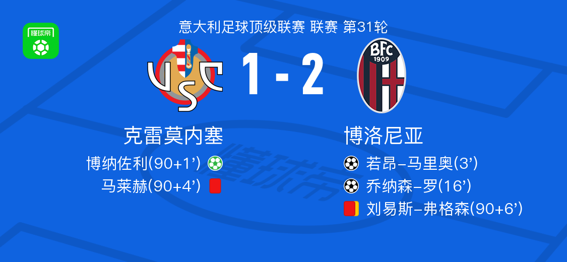 意甲第31轮:克雷莫内塞1 - 2博洛尼亚,若昂 - 马里奥、乔纳森 - 罗建功
