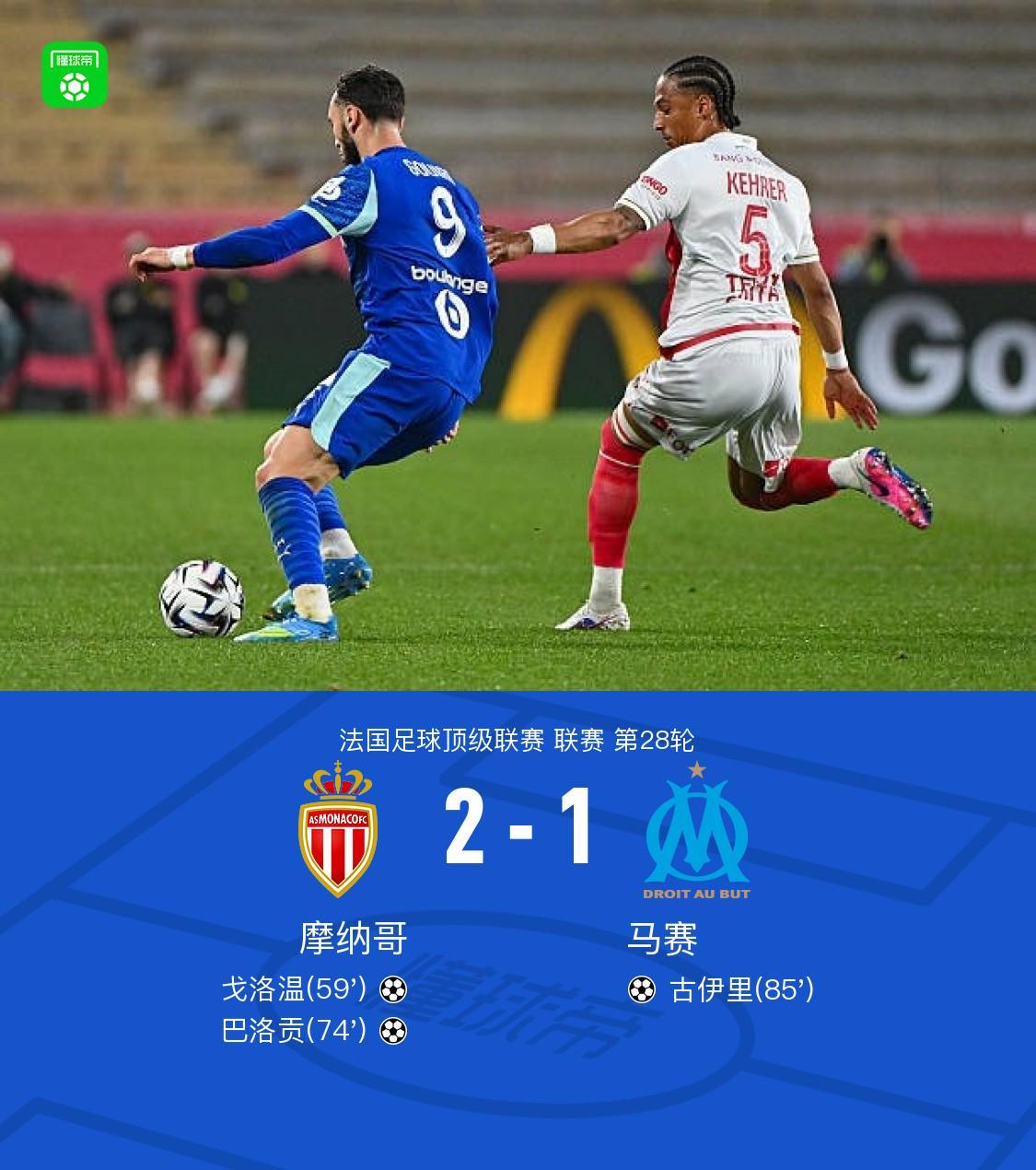 摩纳哥2-1险胜马赛,戈洛温首开纪录,巴洛贡锁定胜局