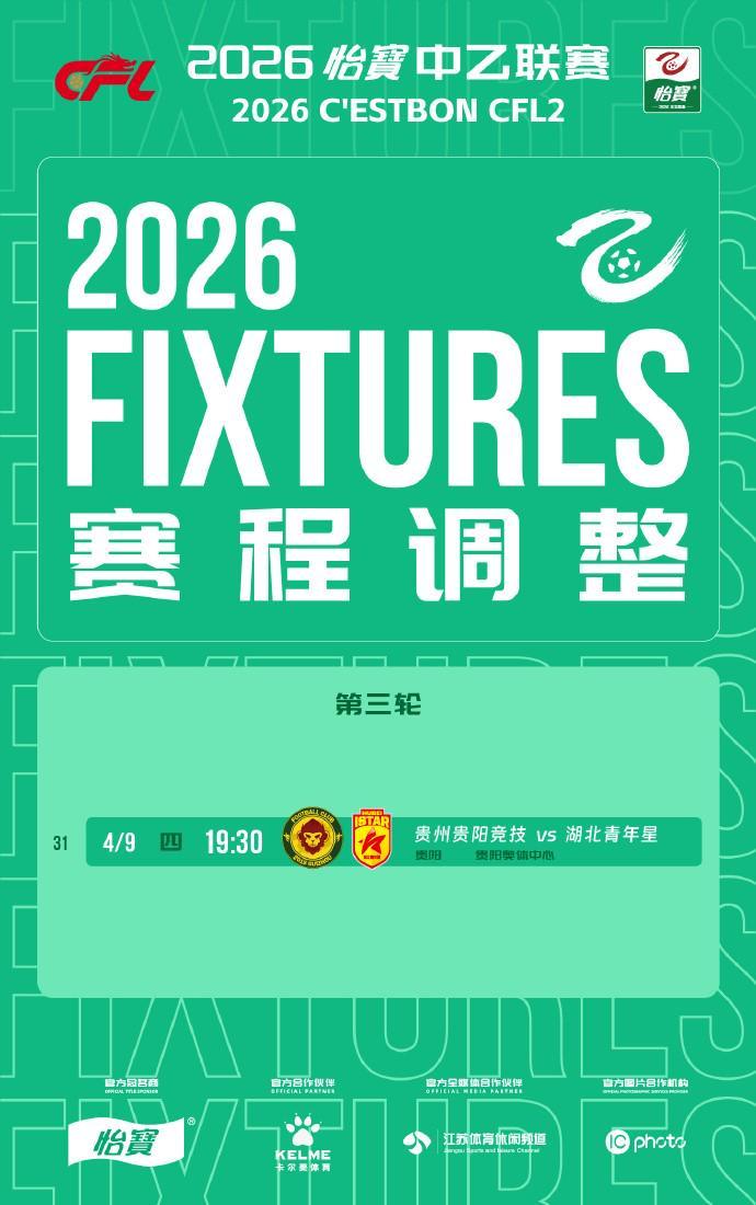 北京时间4月6日消息,据徽声在线从中国足球协会乙级联赛官方渠道获悉,原定于联赛第3轮展开的贵州贵阳竞技与湖北青年星的对决,现已正式调整至4月9日举行。