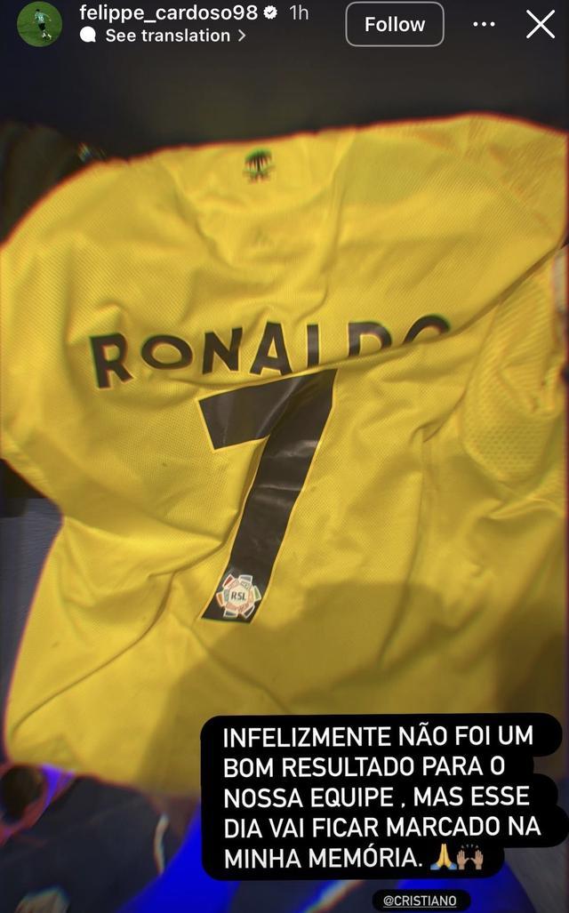 赛后,费利佩-卡多索在社交媒体上兴奋地晒出了与C罗交换的球衣,并深情地留言道:“尽管从球队的角度来看,这个结果并不尽如人意,但能够与如此伟大的球员同场竞技,并交换球衣,这一天无疑将成为我职业生涯中难以忘怀的宝贵记忆。”