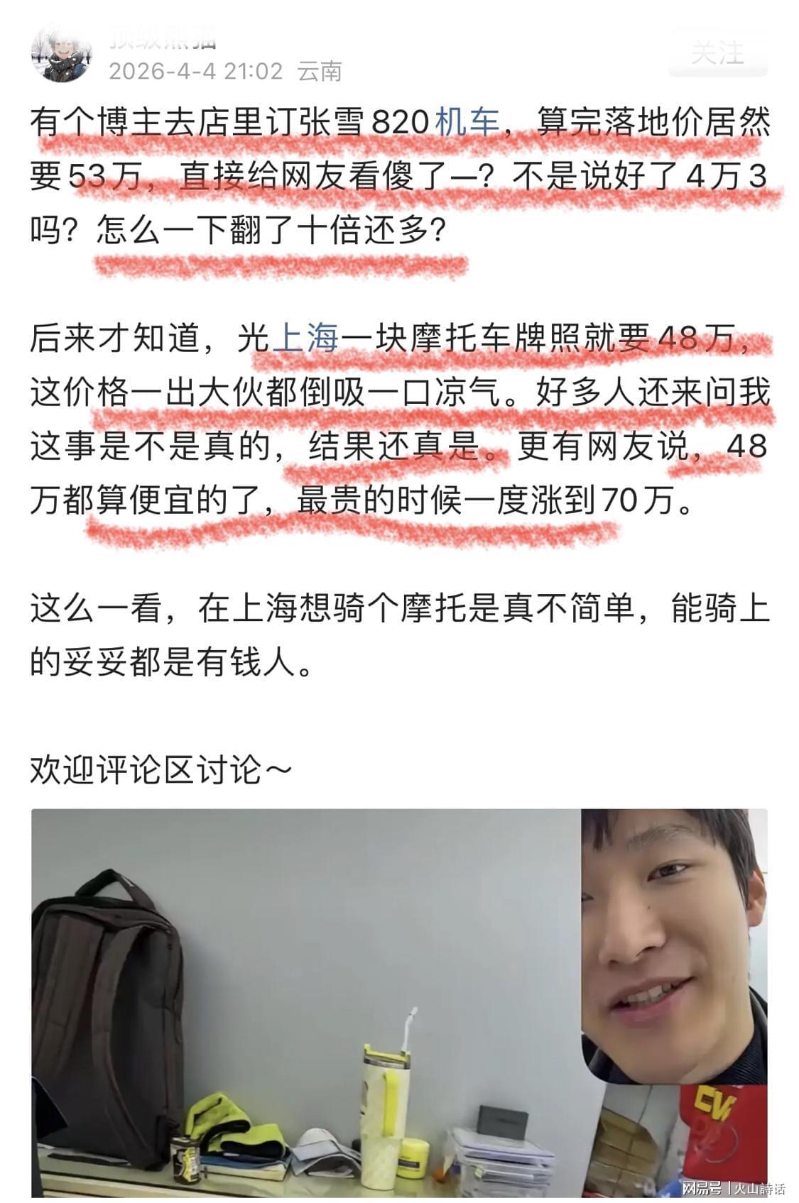 惊爆!张雪820机车上海落地价53万,车价与牌照费相差近十倍
