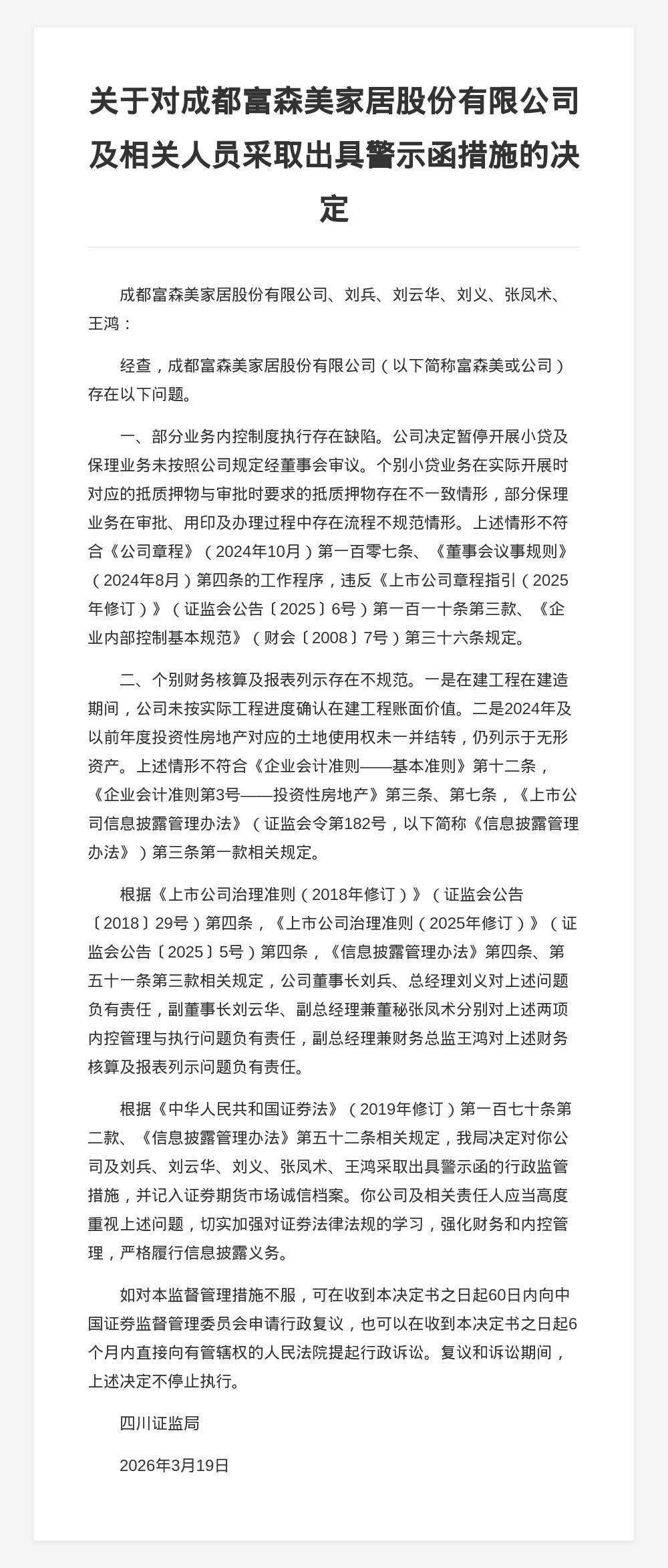 针对上述问题,四川证监局决定对成都富森美家居股份有限公司及其相关责任人刘兵、刘云华、刘义、张凤术和王鸿采取出具警示函的行政监管措施,并将此记录记入证券期货市场诚信档案,以示惩戒。