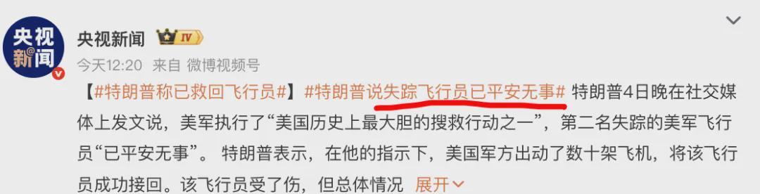 就在不久前,特朗普宣布“第二名副驾驶位的机组人员已找到并救回”的消息迅速登上热搜。与此同时,伊朗官方的一条说法也被大量转发,同样登上了热搜榜单。