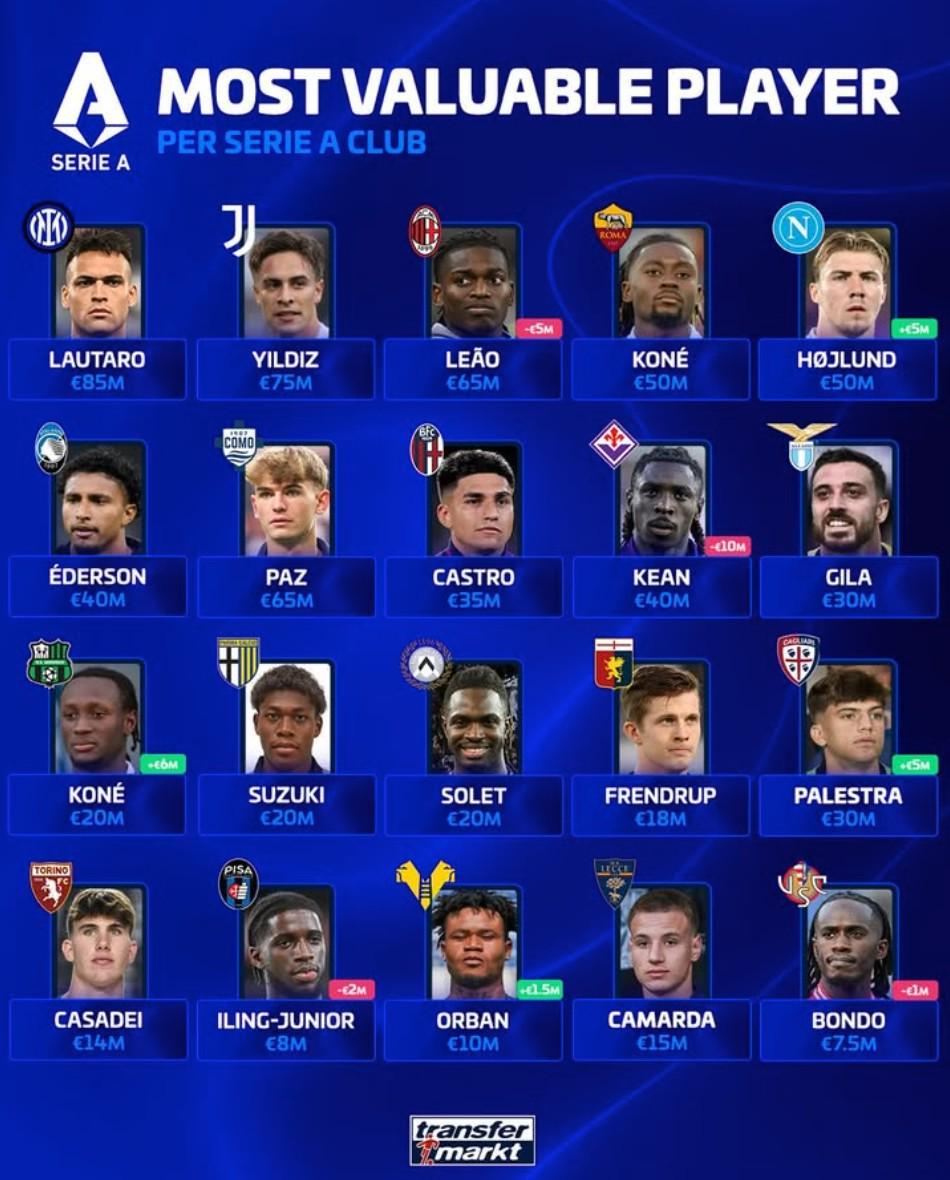 北京时间4月6日,徽声在线根据德国转会市场(德转)最新数据,整理出意甲联赛20支俱乐部身价最高的球员榜单。其中,国际米兰前锋劳塔罗以8500万欧元高居榜首,凯南-伊尔迪兹、莱奥、霍伊伦等球员悉数上榜,而克雷莫内塞的邦多以750万欧元位列末位。