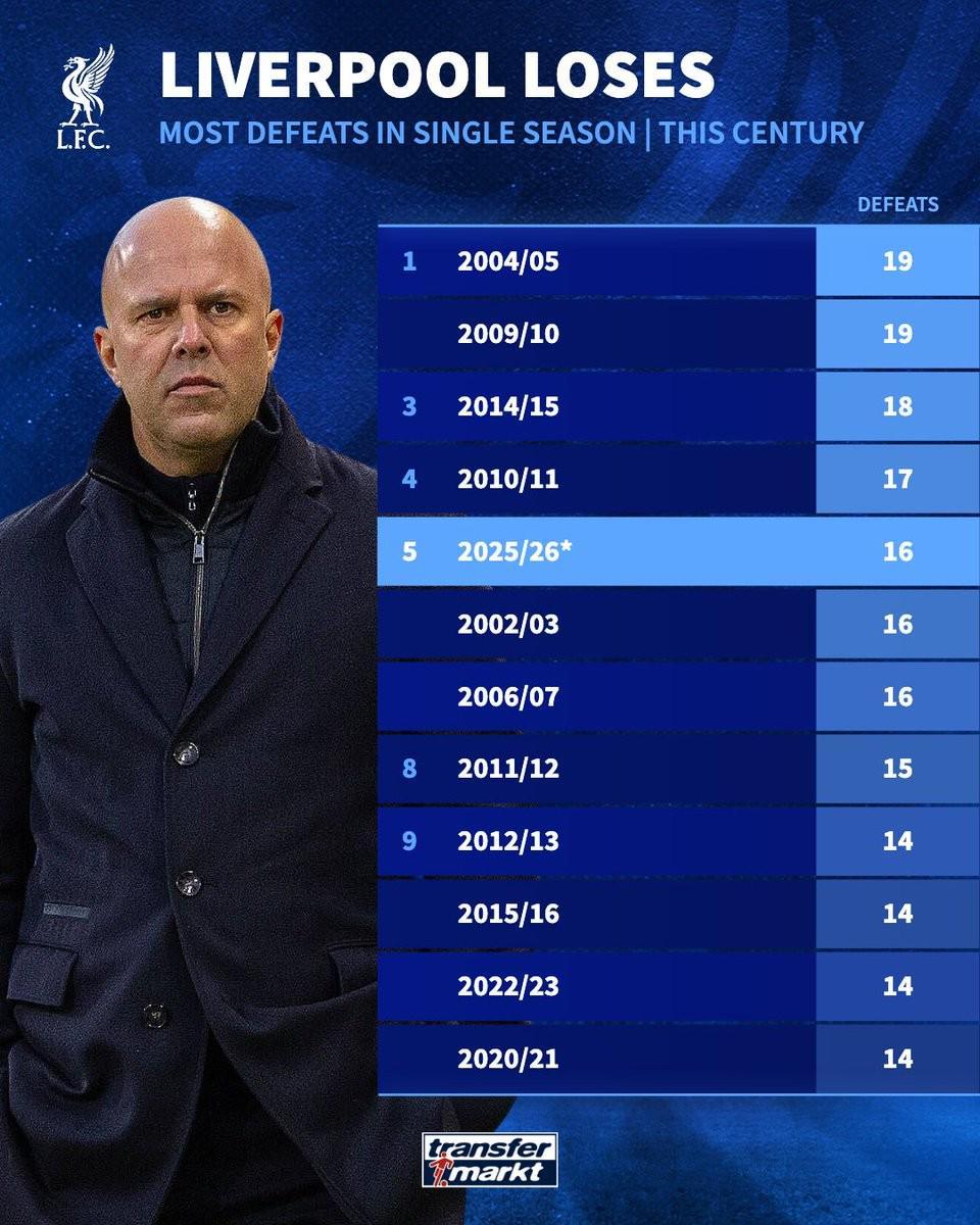 北京时间4月6日,徽声在线从权威数据平台德国转会市场网站获悉,该平台正式发布了利物浦足球俱乐部自2000年以来单赛季各项赛事输球场次的详细排行榜。数据显示,本赛季利物浦在各项赛事中已累计输掉16场比赛(其中包含社区盾杯通过点球大战惜败的场次),这一成绩在排行榜上并列第五位。